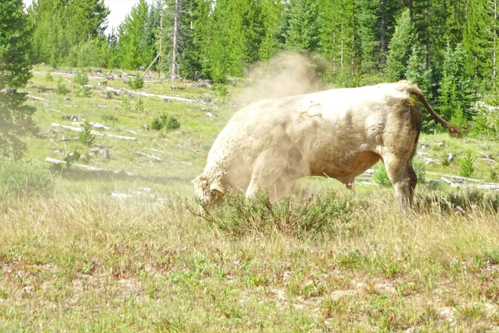 Standing on the dirt, they towered over some of the other cows. Suddenly, one of them violently pounded its hoof into the ground, raising a thick cloud of dust. Then, it rubbed its head against the dirt, snorting all the while. After several repetitions, it stopped and an even larger companion completed the same ritual. He raised his enormous head, sneered and bellowed a high volume low.